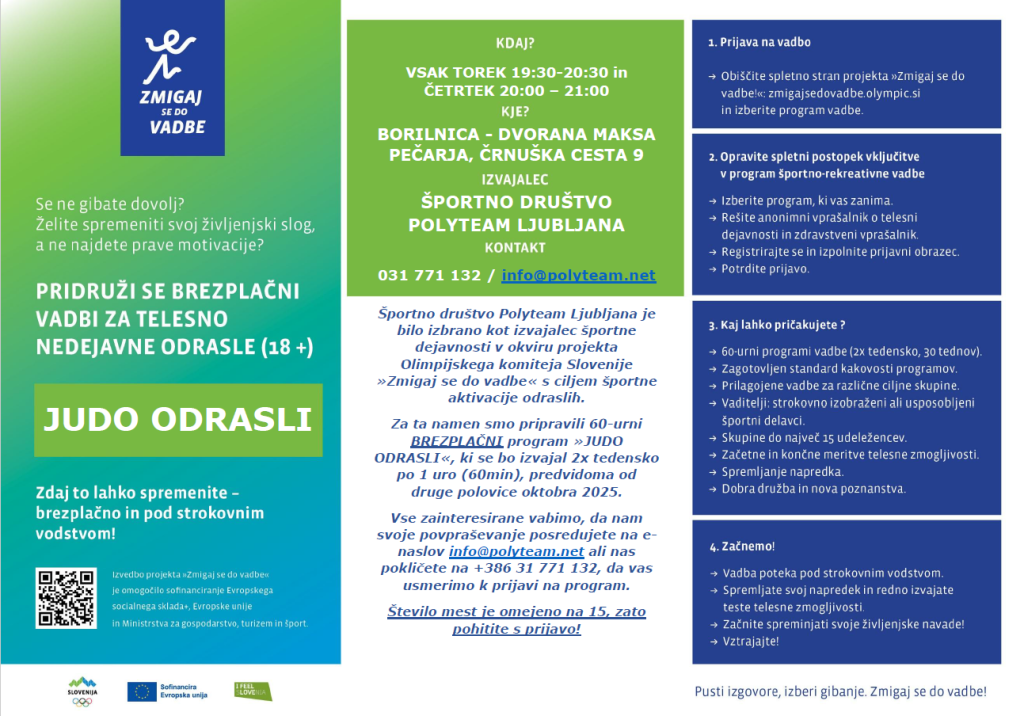 Za ta namen smo pripravili 60-urni BREZPLAČNI program »JUDO ODRASLI«, ki se bo izvajal 2x tedensko po 1 uro (60min), predvidoma od druge polovice oktobra 2025.